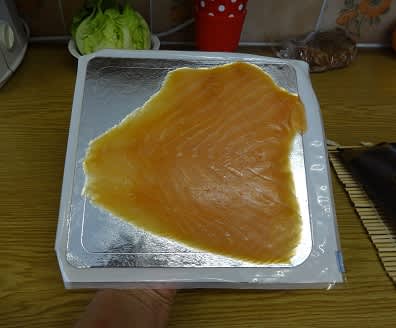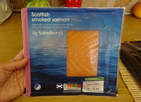 夕飯には、奮発してスモーク・サーモンを買ってきました。 120gで£3(≒¥552)。