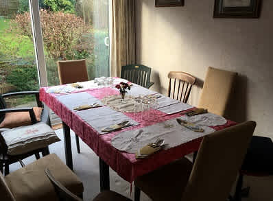 テーブルクロスはビニール製の安物ですが、家族だけだからこれで十分。