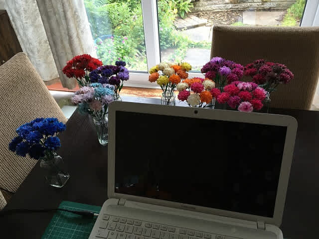 居間の私の定位置は、ペーパーフラワー工房と化しています。